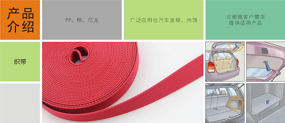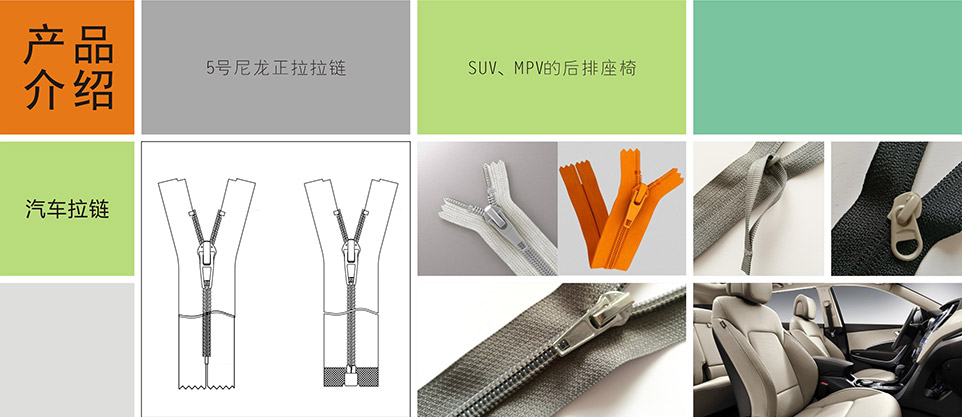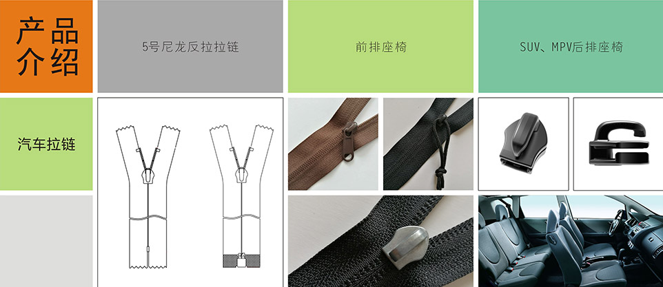 我們提供汽車(chē)專(zhuān)用拉鏈、標(biāo)識(shí)扣、標(biāo)識(shí)嘜、粘扣帶/刺毛帶,織帶/松緊帶,塑料扣件等其他汽車(chē)內(nèi)飾、汽車(chē)座椅系統(tǒng)部件。